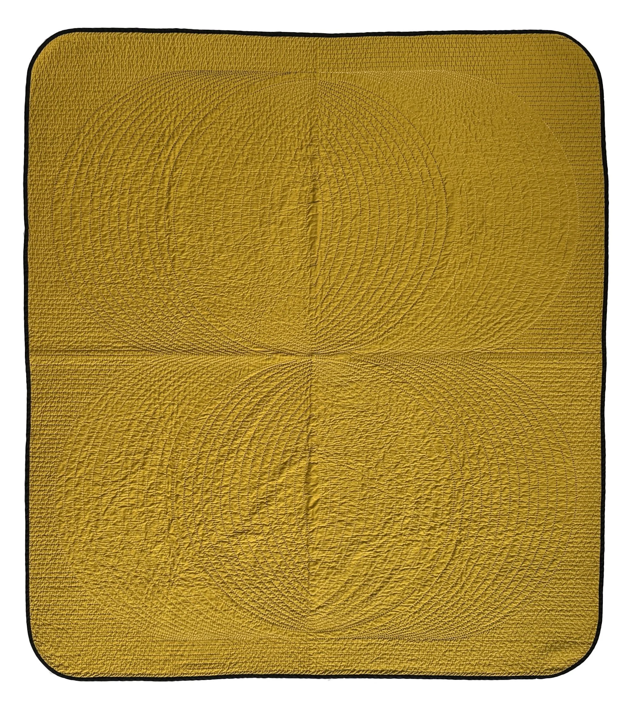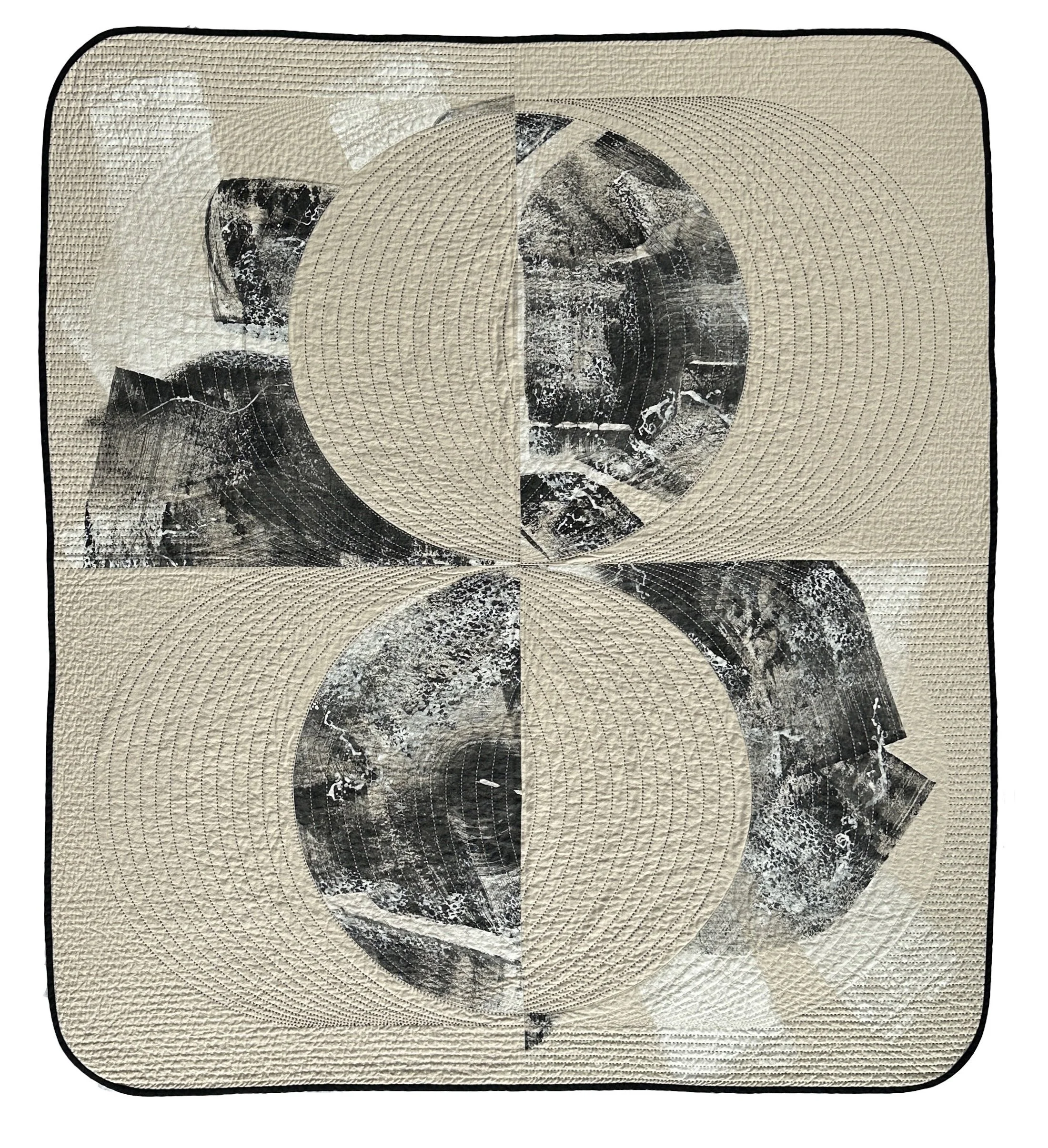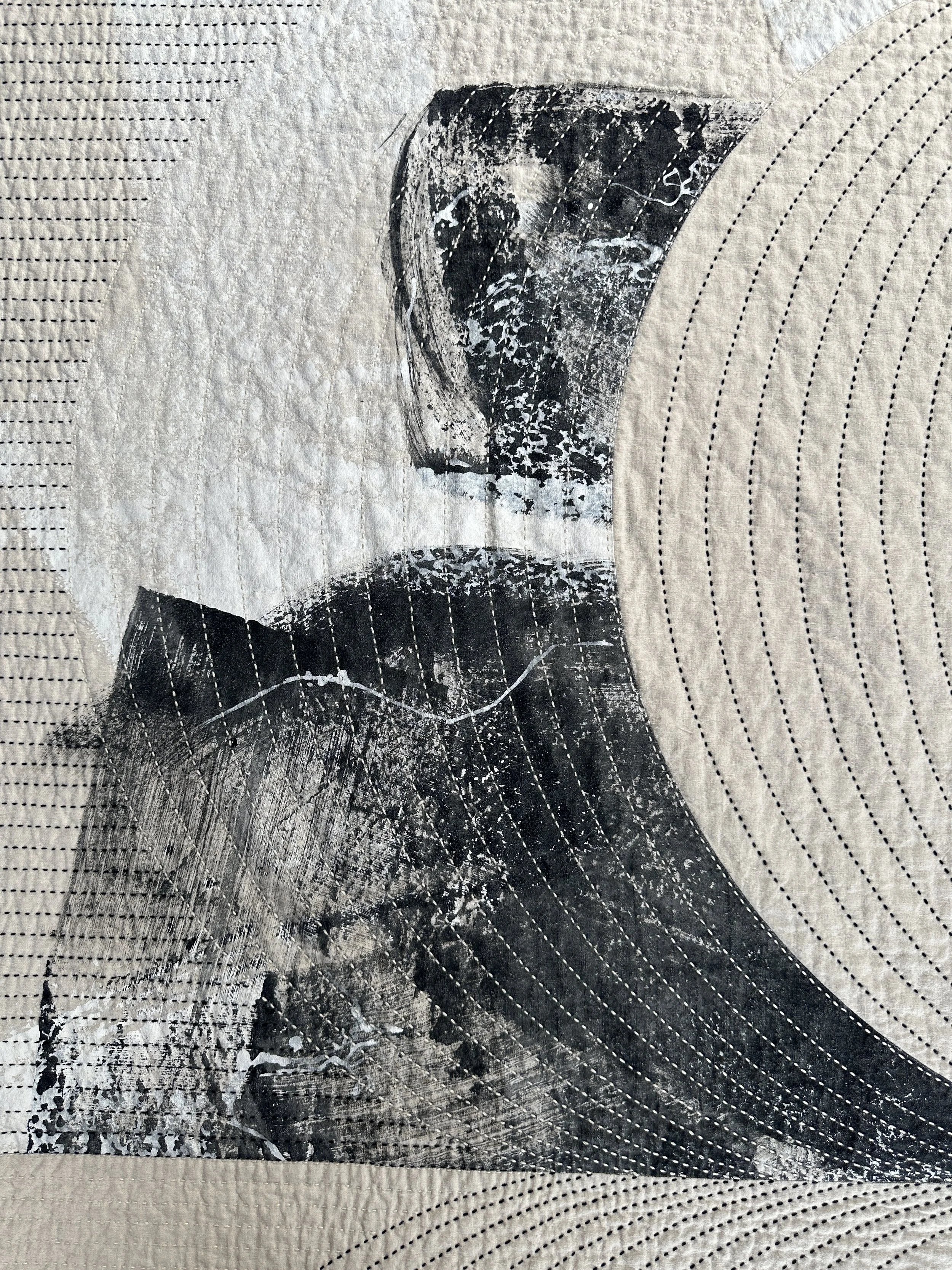 Rachel applied an abstract painting on the linen with garment ink (meant to resemble calcium encrustation on lava rock found here on Hawai’i Island). Then, handed it off to Dani with complete trust. They agreed on the final pattern that Dani brilliantly designed, and she then hand-quilted the entire piece!