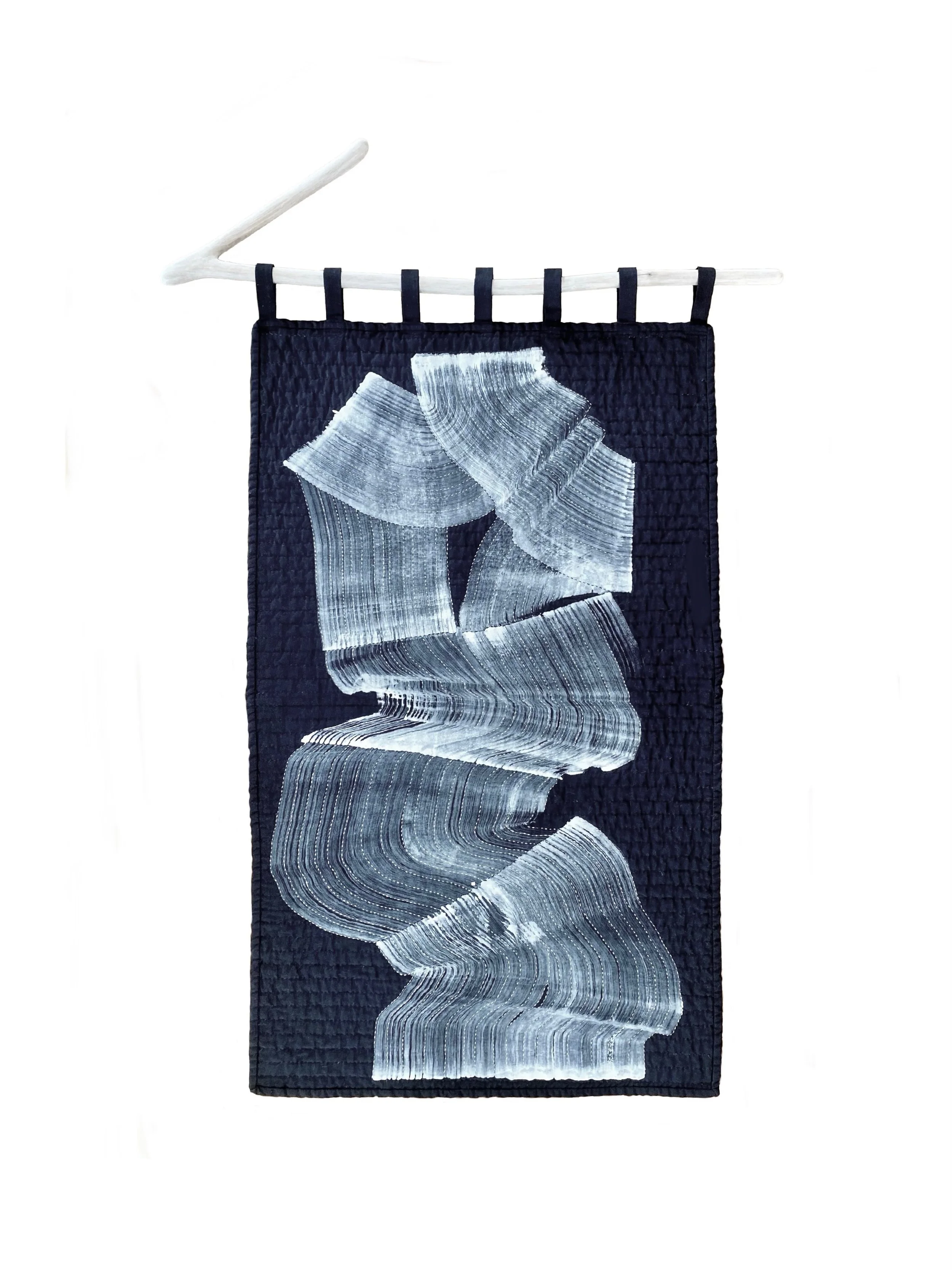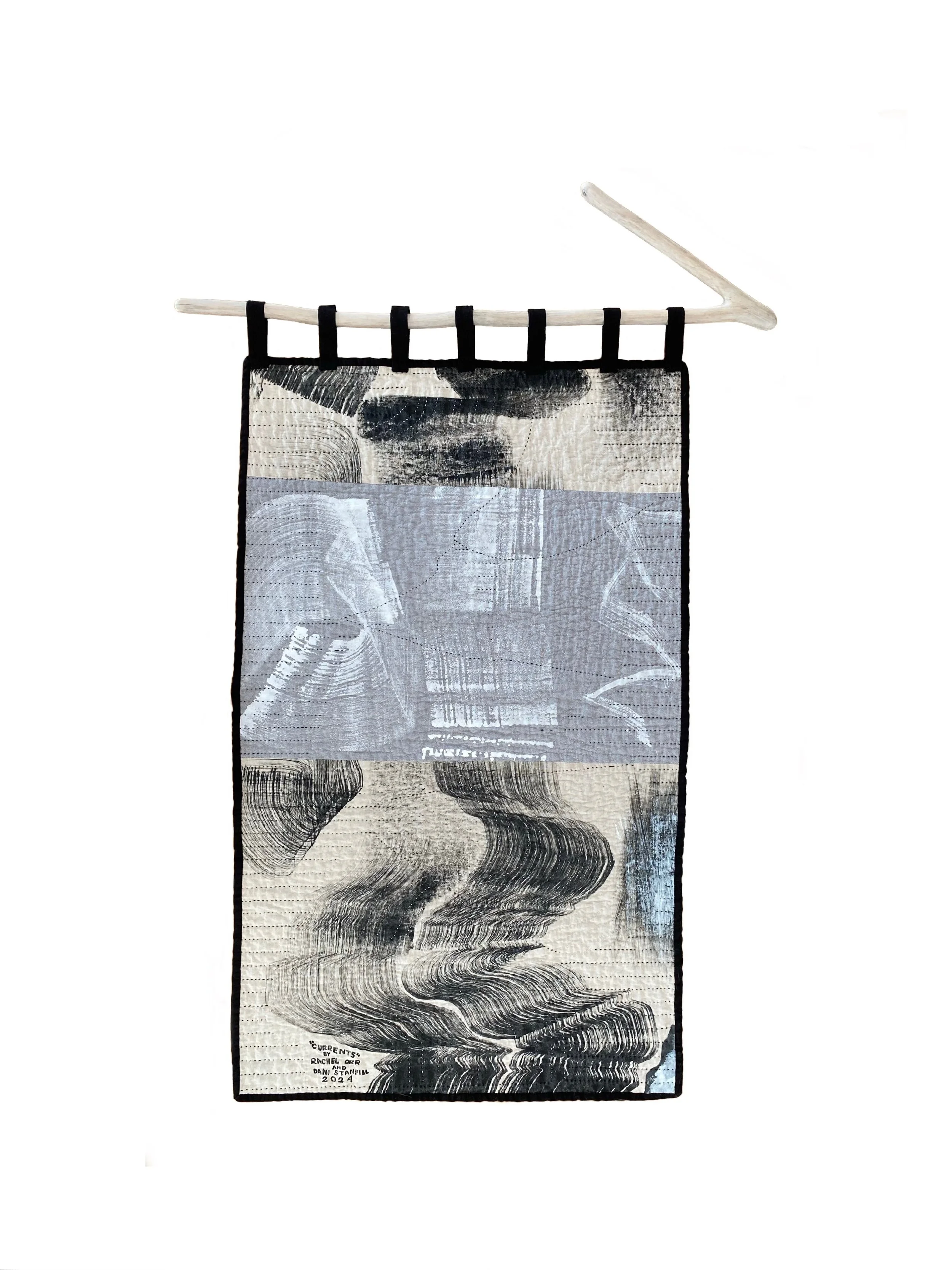 CURRENTS (front) created using garment ink painted on linen (Orr) and hand-stitched quilting (Stanfill). It is mounted on a Lomi Lomi stick made from Strawberry Guava wood.